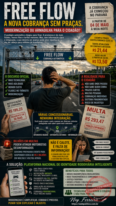 Brasil·Paraná·Política·Tecnologia Free Flow no Paraná: modernização ou penalização do cidadão 24 de abril de 2026 por Ney Ferreira A cobrança automática no Paraná promete eficiência, mas a falta de integração e informação pode gerar multas injustas. Sem um sistema unificado, o motorista Leia Mais